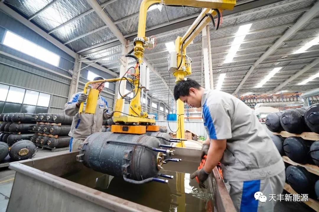 為了保證產品質量,天豐公司要求每臺產品都要進行1.0兆帕的氣密性試驗,從而確保每臺出廠產品都是合格品,達到“0不良”的成效。由公司專門研發的多工位碼垛試壓一體機,集碼垛、轉運、翻轉、試壓等功能于一體,能夠快速高效的實現內膽的試壓、碼垛、轉運、翻轉等工作,提升了工作效率。